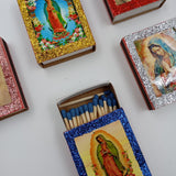 Un pequeño objeto con un gran impacto visual. Nuestras cajitas de cerillos están decoradas a mano con imágenes de la Lotería, Selena, Juan Gabriel, la Catrina y la Virgen de Guadalupe, fusionando tradición y cultura pop en una pieza única.
